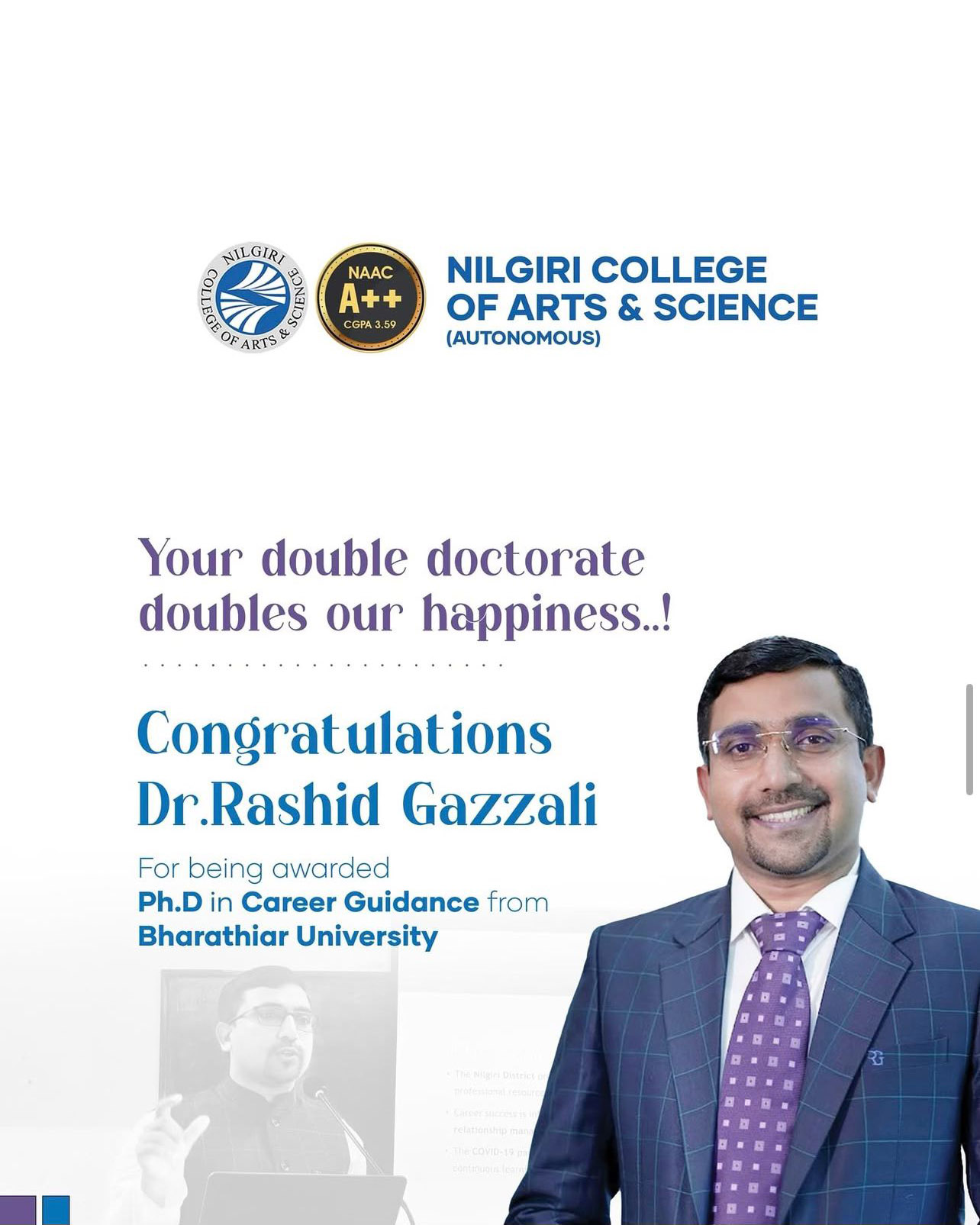Dr. Rashid Gazzali has been awarded his second Doctorate (Ph.D.) in Career Guidance from Bharathiar University, adding yet another remarkable milestone to his distinguished academic and professional j ...